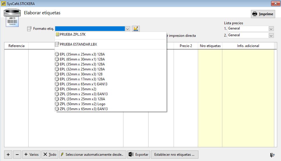 A. Formato etiq: permite seleccionar el formato de impresión de etiquetas previamente configurado. Este define el diseño, tamaño y distribución de la información en la etiqueta.