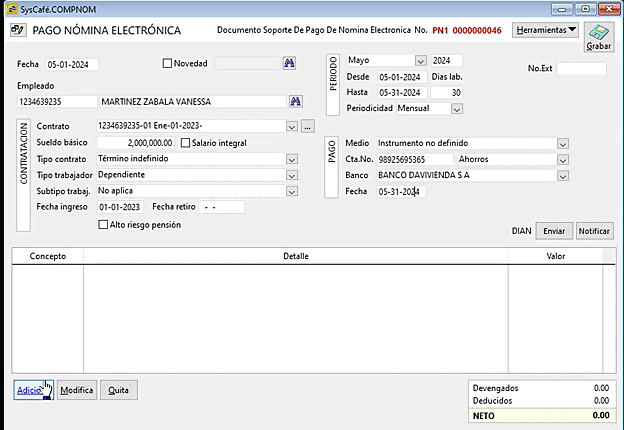 De manera manual, debe elaborar el comprobante por cada PN (nómina electrónica) que haya sido previamente elaborada y enviada. Es necesario ajustar la información requerida, adicionando o retirando datos según corresponda. Por ejemplo, si en la QN (nómina electrónica) se adicionó el concepto de Hora Extra que no se registró en el PN (documento soporte de nómina), el valor neto será diferente al de la PN original.